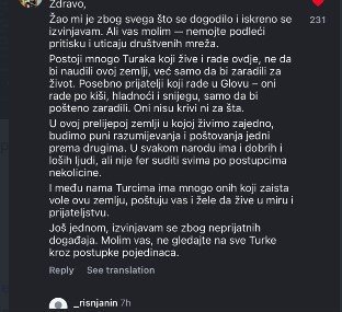 "Žao mi je zbog svega što se dogodilo i iskreno se izvinjavam. Ali vas molim — nemojte podleći pritisku i uticaju društvenih mreža. Postoji mnogo Turaka koji žive i rade ovdje, ne da bi naudili ovoj zemlji, već samo da bi zaradili za život.