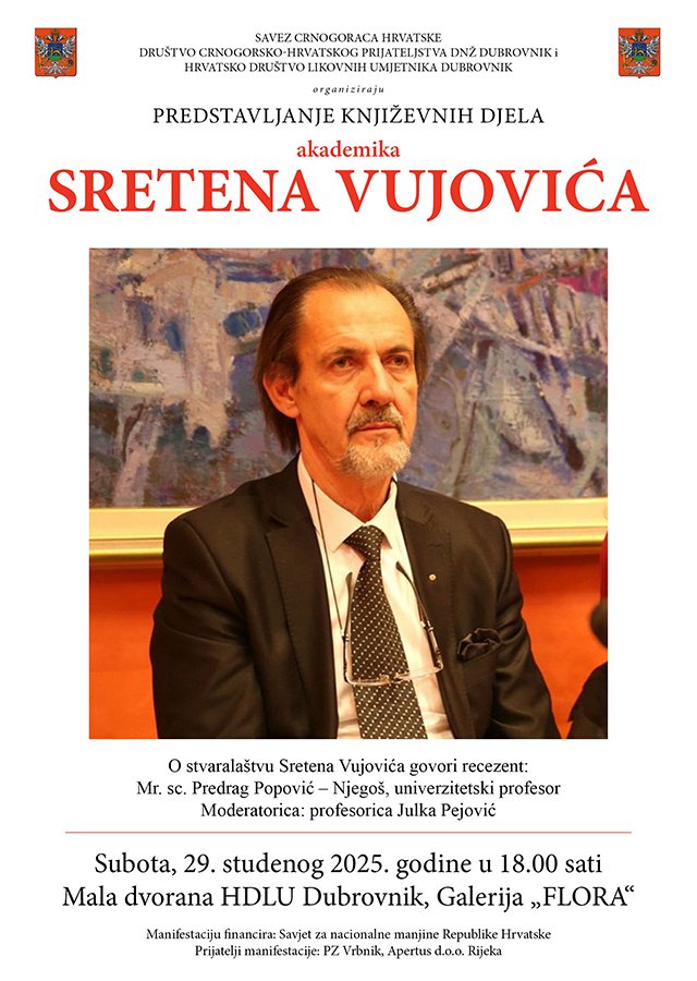 Savez Crnogoraca Hrvatske, Društvo crnogorsko-hrvatskog prijateljstva DNŽ Dubrovnik i Hrvatsko društvo likovnih umjetnika Dubrovnik, u sklopu svojih redovnih aktivnosti na njegovanju crnogorskog kulturnog i nacionalnog identiteta, te plodne sararadnje u sklopu aktivnosti Društva Crnogorsko-hrvatskog prijateljstva, organizuju predstavljanja književnog stvaralaštva akademika Sretena VUJOVIĆA, koji nesumnjivo pripada samom vrhu savremene crnogorske književnosti. Sreten Vujović je jedan od onih crnogorskih kulturnih djelatnika, koji je, sa dobro poznatom grupom intelektualaca devedesetih bio antiratno angažovan zbog čega je njegov život obilježen hapšenjima, progonom sudskim procesima, kao što je to i danas u aktuelnom trogodišnjem sudskom procesu, zbog angažmana u zaštiti ljudskih prava.