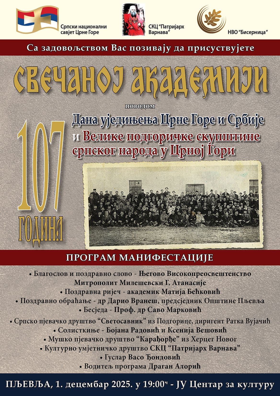 Da će i ove godine u Centru za kulturu u Pljevljima prirediti svečanu akademiju povodom 107. godišnjice, kako su naveli, Velike podgoričke skupštine srpskog naroda u Crnoj Gori i Dana ujedinjenja Crne Gore i Srbije, Srpski nacionalni savjet, SKC „Patrijarh Varnava“ i NVO „Bisernica“ najavili su još 22. novembra.