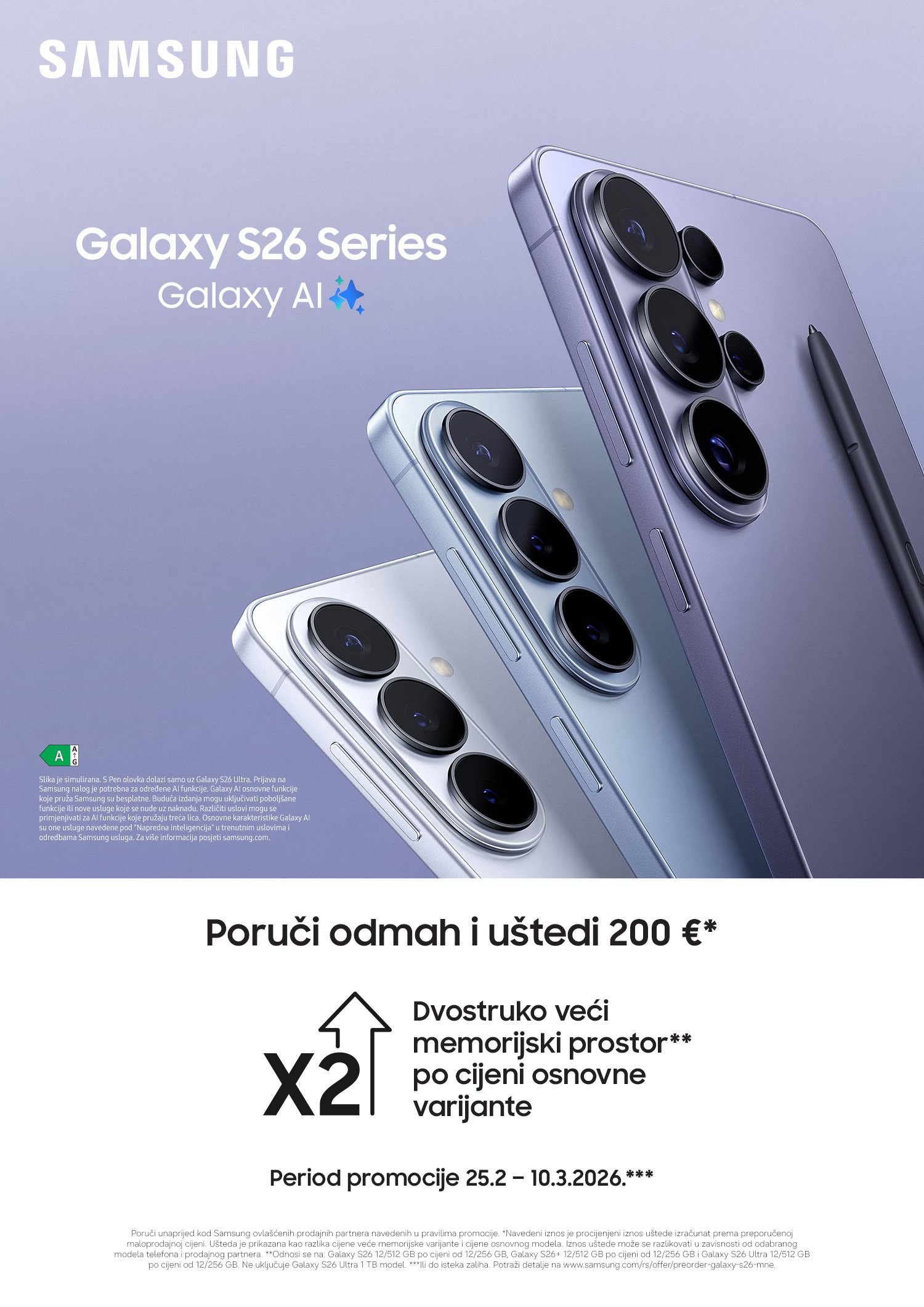 verzije od 256GB. Za sve informacije o Galaxy S26 seriji posjetite https://www.samsung.com/rs/
