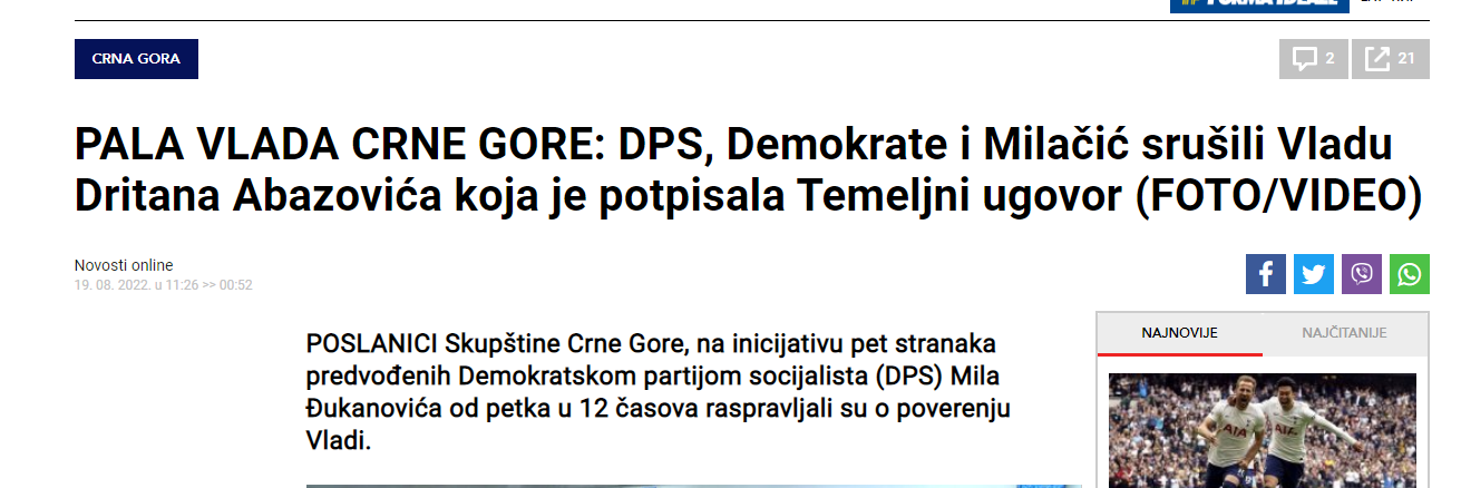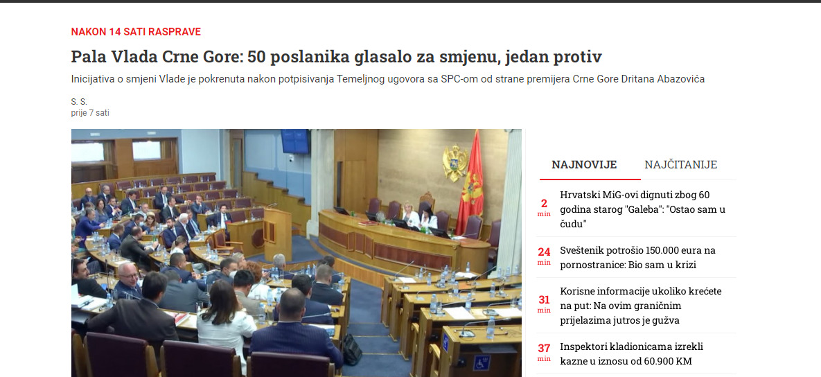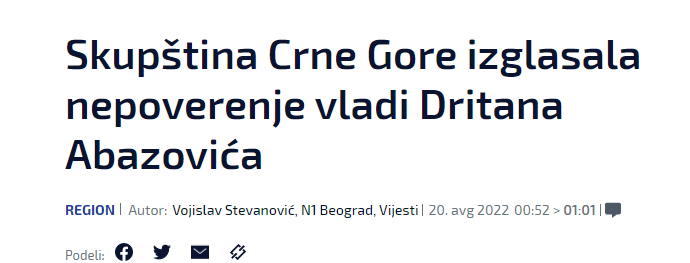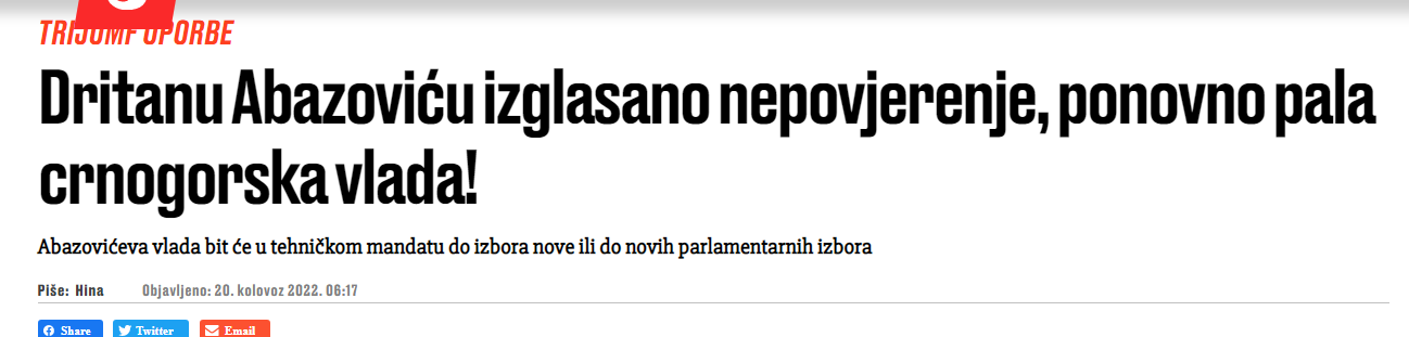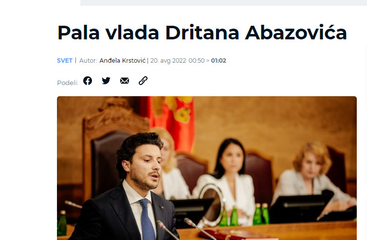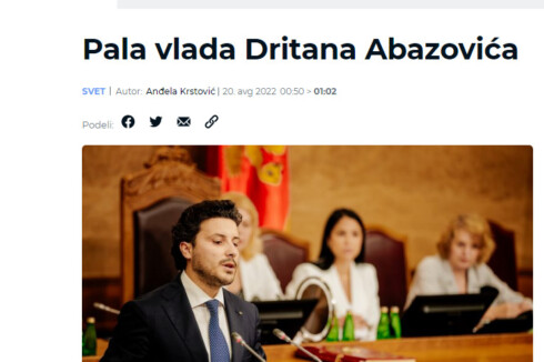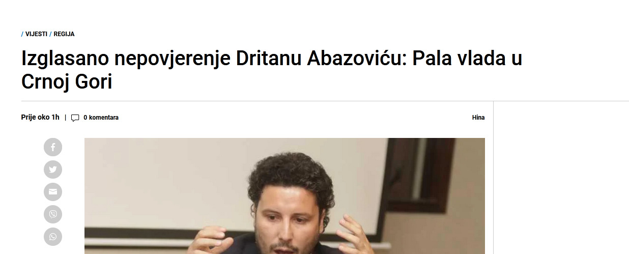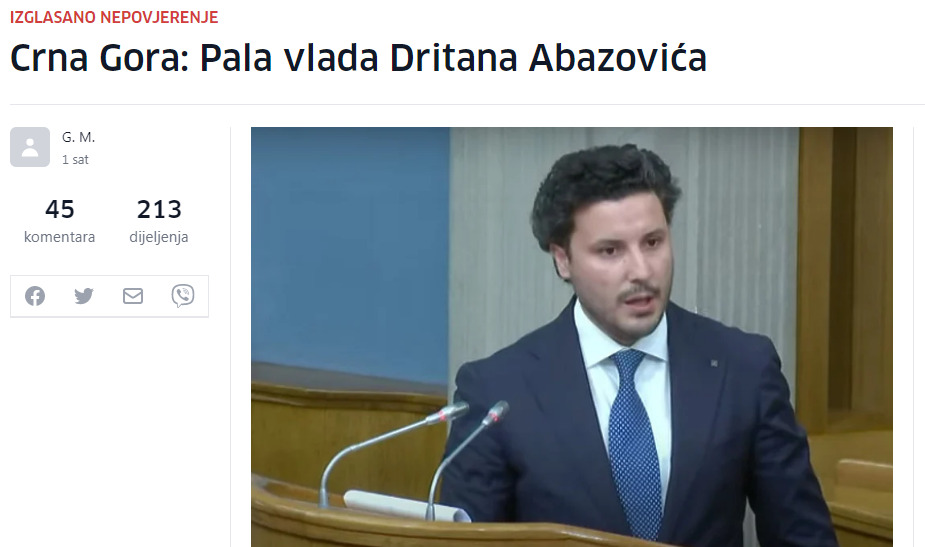 Pad Vlade Dritana Abazovića glavna je vijest i u regionalnim medijima. Abazovićeva vlada biće u tehničkom mandatu do izbora nove ili do novih parlamentarnih izbora.