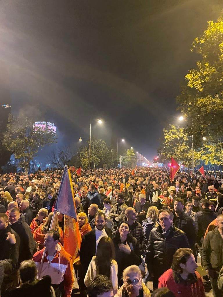 “Prva…Hjde da dignemo (ruke/telefone, zastave…), nek vide “kolicko“ nas ima! Neka šegrti koncerna „Vesti“ , da ih ne zaklinjem u istinu, prebroje koliko stotina slobodnih i nepokornih građana je večeras pred palom Skupštinom Crne GoE! Stotine stotina nas je, Dritanoidi! I više će nas biti”, rekao je on-