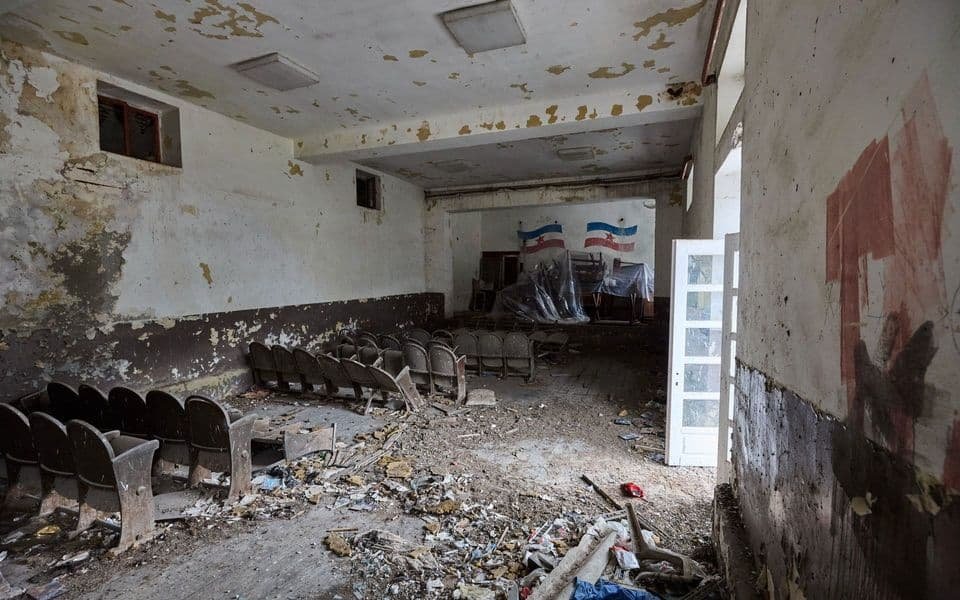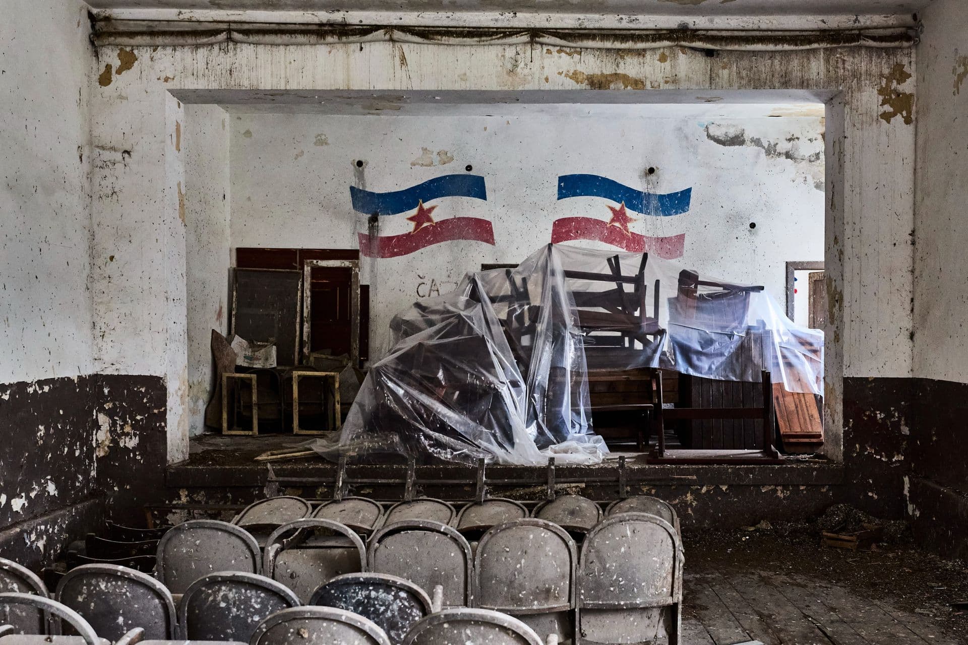 Jugoslovenske zastave podsjetnik na neka davnašnja vremena (FOTO: Stevo Vasiljević/Pobjeda)Sjedišta u sali, kojih je po svjedočenju Milorada Minje Ražnatovića nekada bilo 220, u stanju su totalnog haosa. Mnoga su iščupana iz ležišta, nagnuta pod neprirodnim uglovima, stvarajući haotične barikade u sali. Letvice, koje su nekada činile naslone, sada su razbacane po podu. One preostale, koje još stoje u nizu, izvijene su od vlage, pocrnjele i prekrivene paučinom.