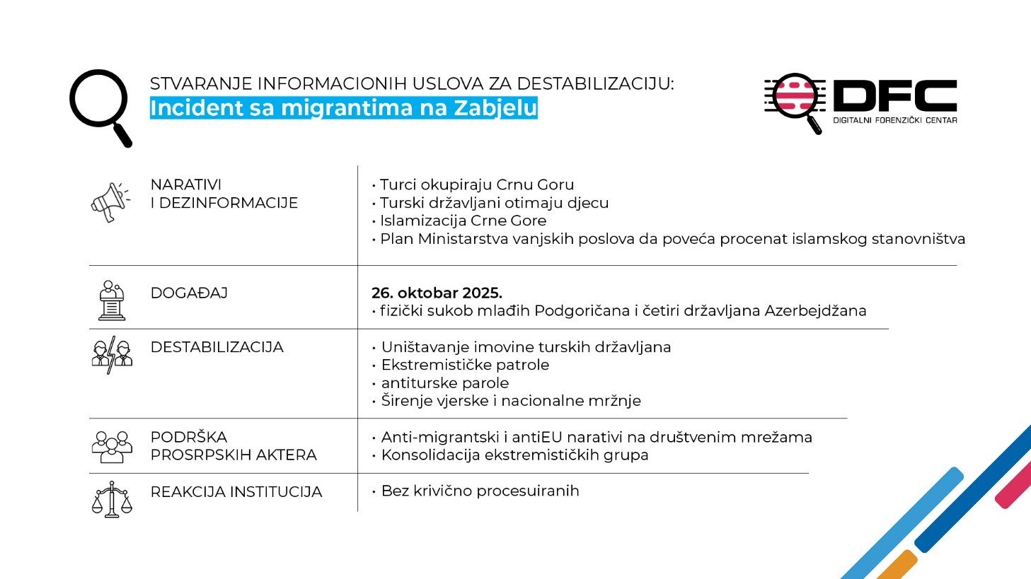 Identičan obrazac djelovanja ponovio se prije i nakon incidenta sa stranim državljanima u naselju Zabjelo u Podgorici, u kojem je povrijeđen crnogorski državljanin. Prosrpske medijske i političke strukture kreirale su prethodno narativ o Crnoj Gori koju okupraju Turci, te da se u Crnoj Gori nalazi 100.000 Turaka. Analogno događaju u Beranama, NSD je izdala saopštenje u kojem zahtijevaju odlučnu reakciju institucija. Uslijedila je hitna odluka Vlade o zabrani bezviznog režima sa republikom Turskom. Ishitren odgovor Vlade i konstituenata vlasti podstakao je ekstremno desničarske strukture i pravoslavna bratstva da organizuju ulične patrole. Te grupacije su dva dana nakon incidenta na Zabjelu širile vjersku i nacionalnu mržnju, uzvikujući antiturske i antiislamske poruke ulicama Glavnog grada i uništavajući imovinu turskih državljana. I u tom slučaju reakcija institucija nije bila adekvatna, a po navodima Uprave policije prekršajno su procesuirane dvije osobe iz uličnih patrola.