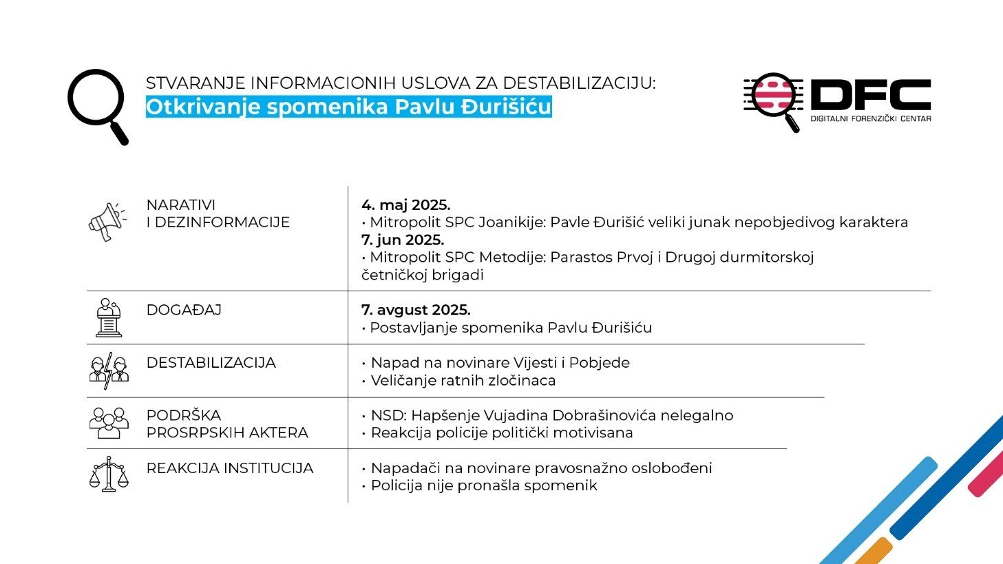 Postavljanju spomenika Pavlu Đurišiću u avgustu 2025. godine prethodile su aktivnosti sveštenstva SPC. Oni su u maju iste godine veličali njegov lik i djelo, a u junu organizovali parastos Prvoj i Drugoj durmitorskoj četničkoj brigadi. I pored činjenice da je javnost bila upoznata sa namjerama SPC i prosrpskih struktura vezanim za postavljanje spomenika, reakcija institucija nije bila adekvatna. Uslijedilo je saopštenje Nove srpske demokratije (NSD) u kojem se navodi da je hapšenje Vujadina Dobrašinovića, na čijem je posjedu postavljen spomenik, nezakonito. Takođe, saopštenje poslanika NSD Velimira Đokovića i odbornika NSD u Skupštini glavnog grada Mitra Šušića da je pokretanje optužnog prijedloga protiv Mitropolita SPC Metodija politički motivisan čin na liniji je kontinuiranog hibridnog djelovanja tih formacija. Napad na novinare koji se desio tokom postavljanja spomenika nije adekvatno sankcionisan, a oslobađajuće presude izrečene napadačima potvrđuju da institucije nemaju adekvatne mehanizme u borbi protiv stranog malignog uticaja.