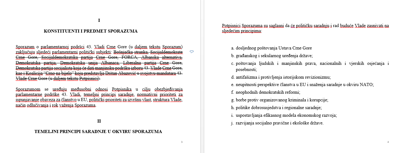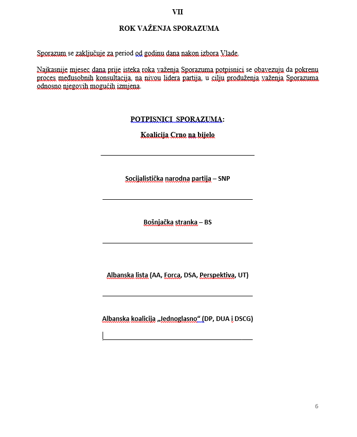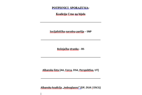U sporazumu koji je predložila opozicija, pisalo je da taj sporazum zaključuju BS, SD, SDP, Forca, AA, DP, DUA, LP, DPS koja će dati manjinsku podršku izboru 43. Vlade Crne Gore, kao i koalicija Crno na bijelo koju predstavlja Abazović svojstvu mandatara 43.Vlade.