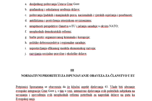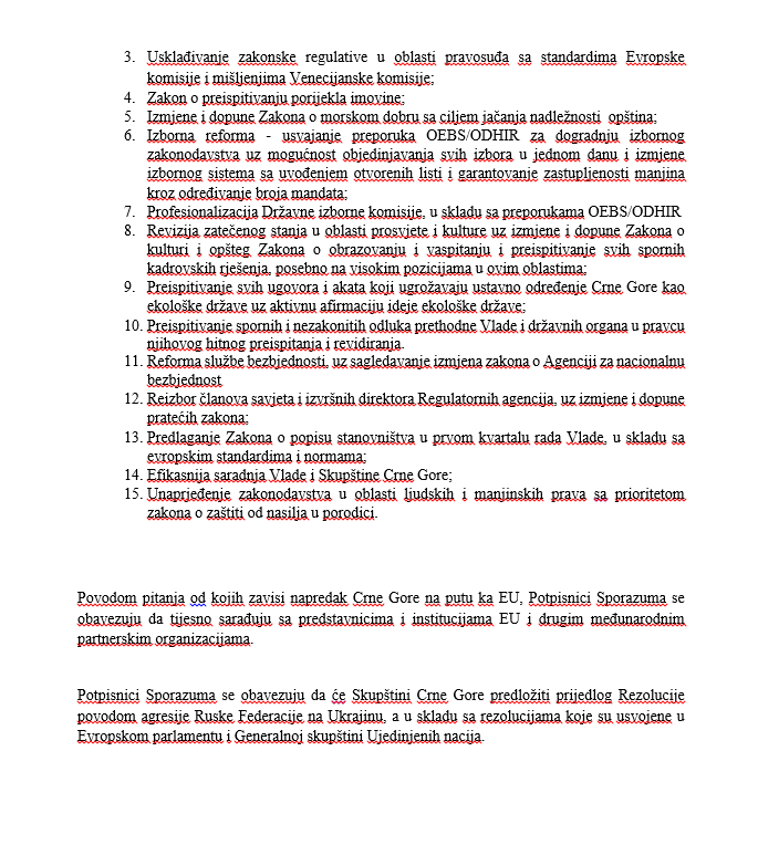Takođe, izmijenjen je dio normativnih prioriteta za ispunjavanje obaveza za članstvo u EU. U dokumentu opozicije je pisalo da se potpisnici sporazuma obavezuju da će na prvoj narednoj sjednici Skupštine podržati prijedlog Rezolucije povodom agresije Ruske Federacije na Ukrajinu i tako iskazati i svoju punu privrženost vanjskoj i bezbjednosnoj politici EU. Abazović u svom dokumentu briše stavku na “prvoj narednoj sjednici”, pa gdje je pisalo podržaće prijedlog Rezolucije povodom ruske agresije na Ukrajinu, piše predložiće i briše stavku da će se iskazati puna prvirženost vanjskoj bezbjednosnoj politici EU.
