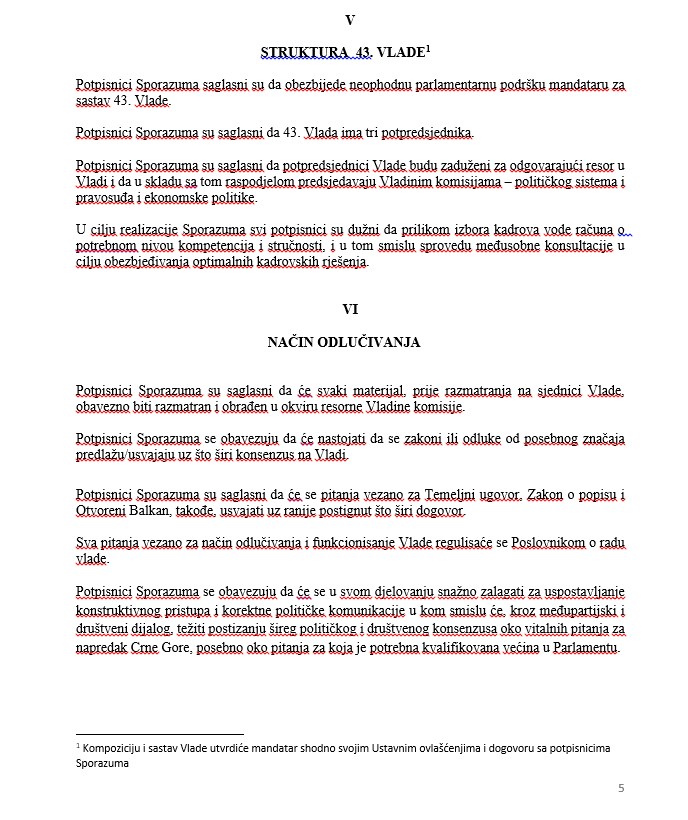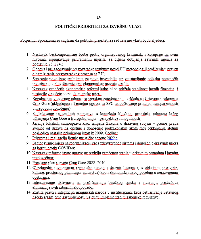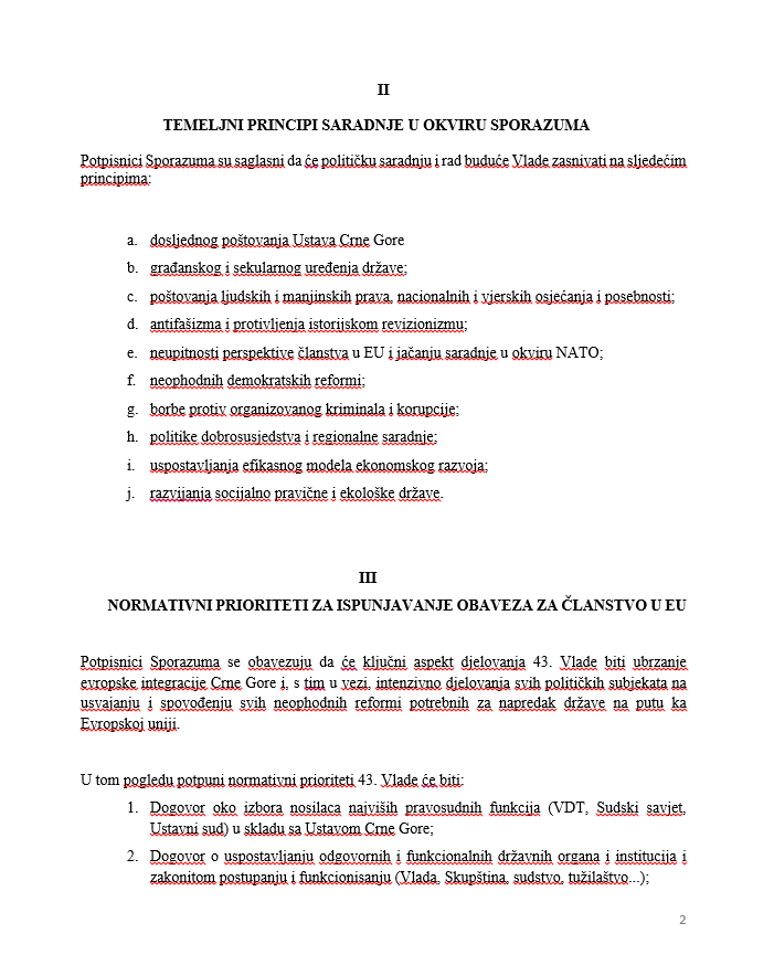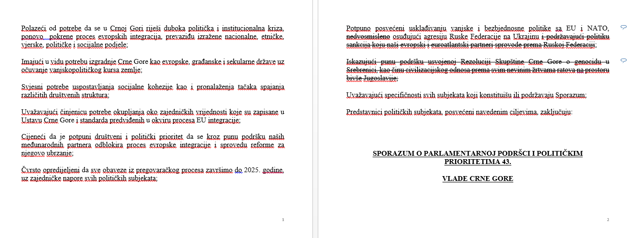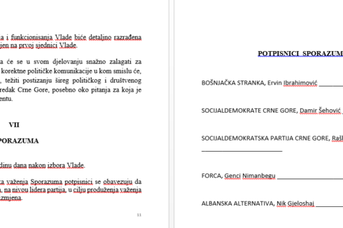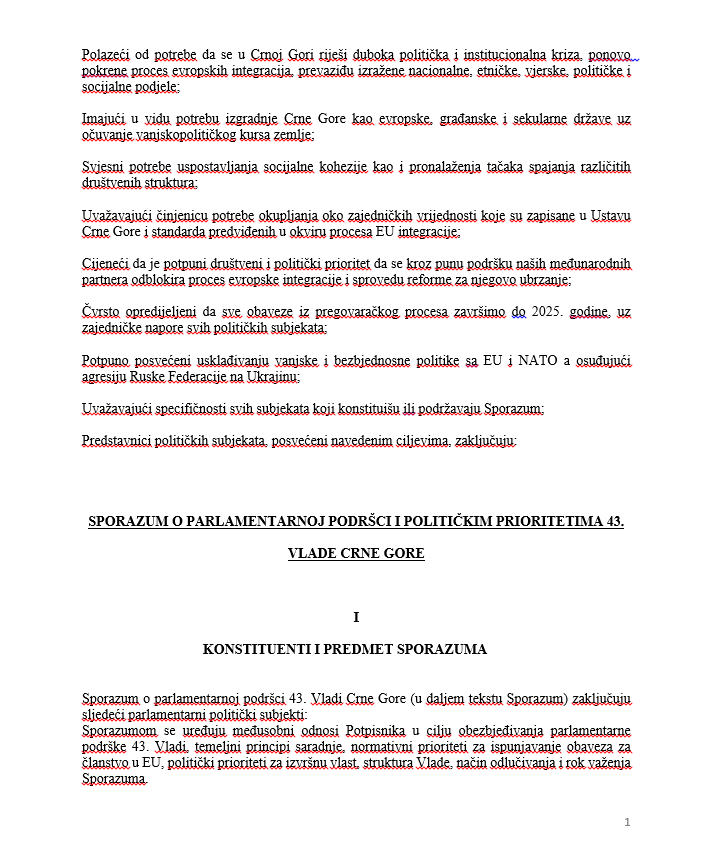 Mandatar za sastav manjinske Vlade Dritan Abazović izmijenio je Sporazum o parlamentarnoj podršci i političkim prioritetima 43. Vlade Crne Gore, koji je pripremila opozicija, napisao je inovirani dokument, koji su potpisali on i lider SNP-a Vladimir Joković, u kojem je izbrisao ključne stavke. Pokušao je i da obmane predstavnike 40 poslanika opozicije da je SNP potpisao osnovni dokument.
