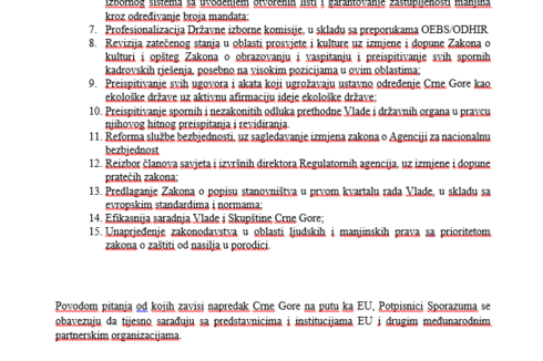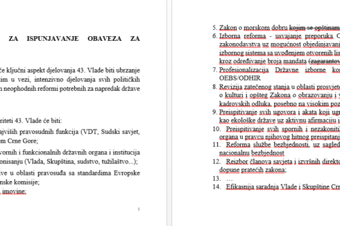 A u inoviranom piše: “Izborna reforma – usvajanje preporuka OEBS/ODHIR za dogradnju izbornog zakonodavstva uz mogućnost objedinjavanja svih izbora u jednom danu i izmjene izbornog sistema sa uvođenjem otvorenih listi i garantovanje zastupljenosti manjina kroz određivanje broja mandata”.
