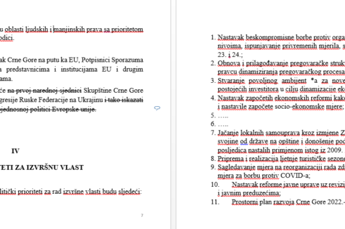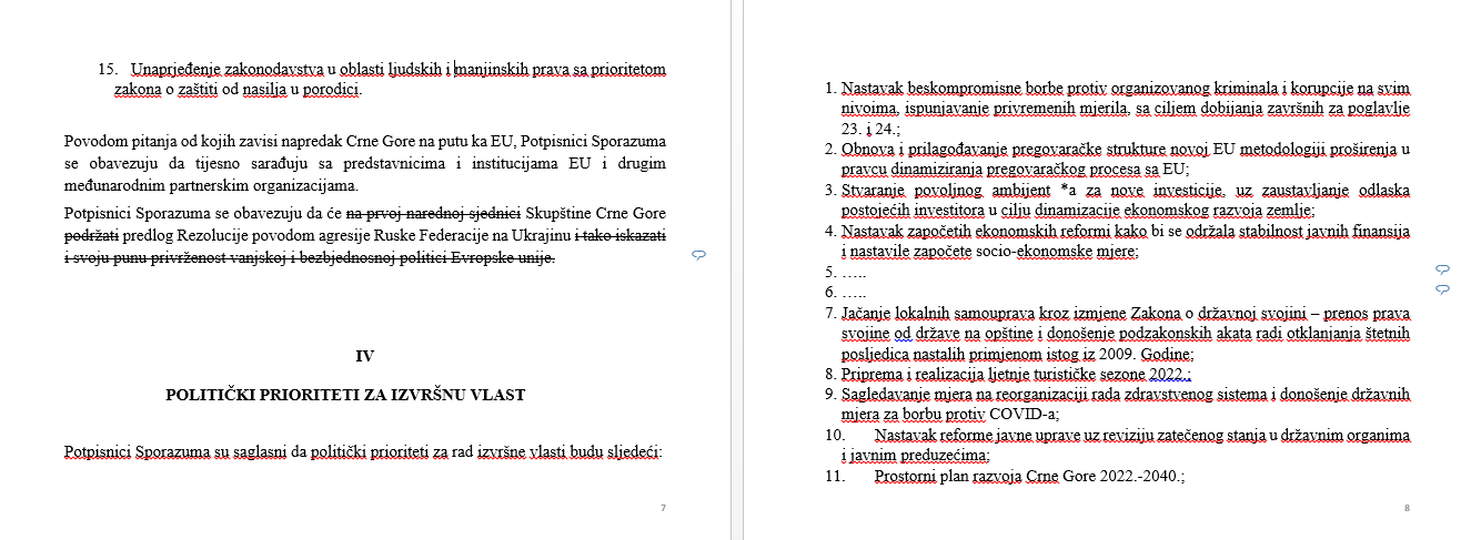 Umjesto “potpuno posvećeni usklađivanju vanjske politike sa EU i NATO, pisalo je “nedvosmileno osuđujući agresiju Rusije na Ukrajinu”. Abazović je izbrisao dio nastavka ove tačke gdje je pisalo “i podržavajući politiku sankcija koji naši evropski i evroatlanski partneri sprovode prema Ruskoj Federaciji”.