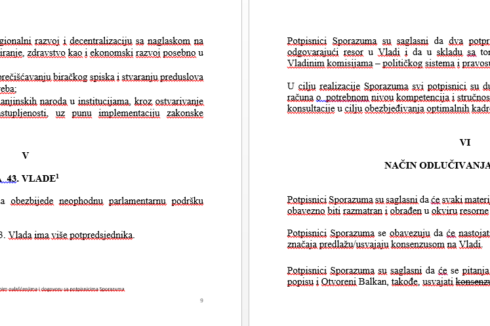 Kod stavki Temeljni ugovor, Otvoreni Balkan i Zakon o popisu, kod opozicije je navedeno da će se odluke donositi konsenzusom, dok je u inoviranom dokumentu navedeno “da će se odluke za ova tri pitanja usvajati uz ranije postignut što širi dogovor”.