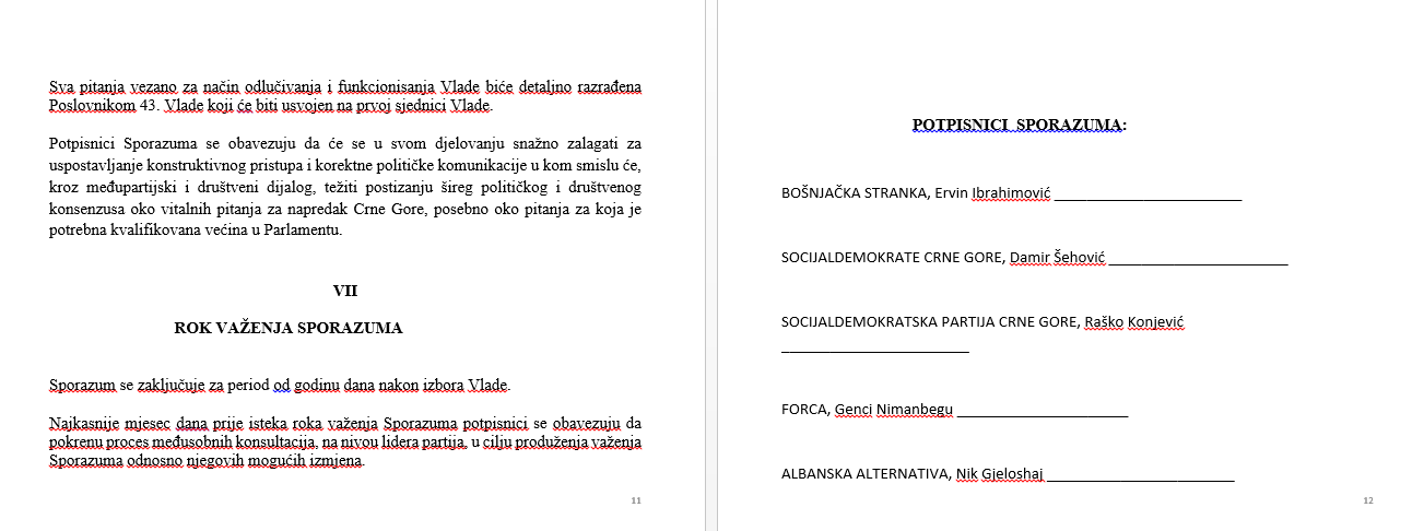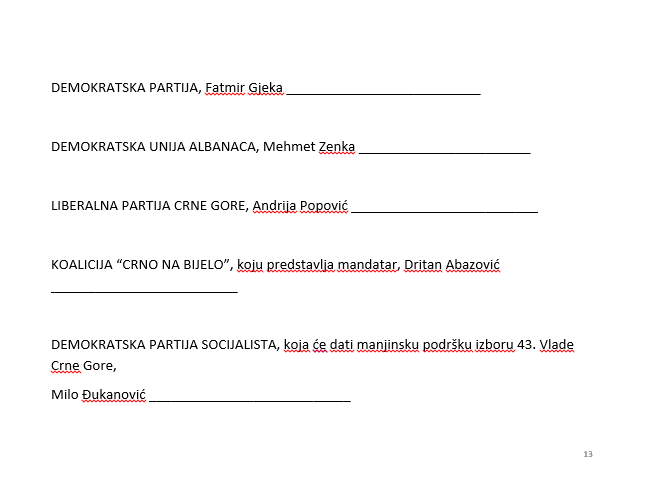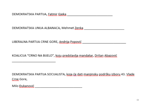 U Abazovićevom dokumentu, ne navodi se ko su potpisnici tog sporazuma, za razliku od jasno navedenih u predloženom sporazumu opozicije.