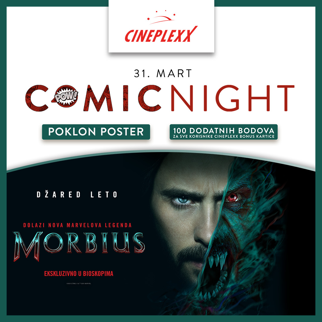 COMIC NIHGT MORBIUS –Četvrtak, 31. mart, u 20h. Sve posjetioce očekuje ekskluzivni poster iz filma i poklon dodatnih 100 CBC bodova. Ulaznice su u prodaji na blagajnama bioskopa.