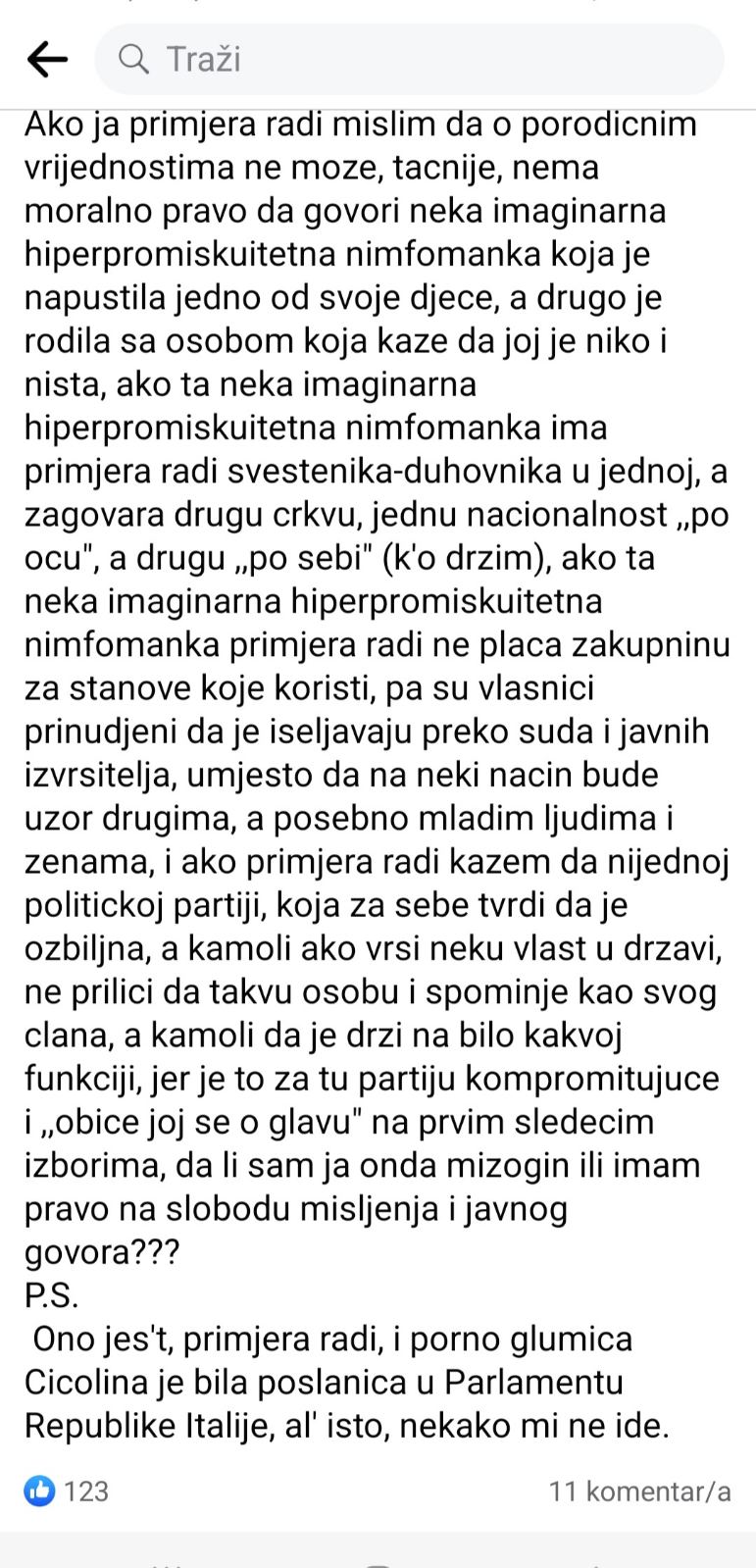 Kako su istakli, građani i građanke Crne Gore ne pristaju da se bilo kojem homofobu, ženomrscu i otvorenom pristrasnom privrženiku SPC daje da zastupa državu (!) u problemu sa SPC. Ovo što kažemo bi se jednako i istom mjerom odnosilo i na sve druge vjerske zajednice da sa njima postoje otvorena pitanja definisanja odnosa sa državom. Važno je da se sačuva objektivnost, neutralnost i stvarna posvećenost zaštiti interesa države.